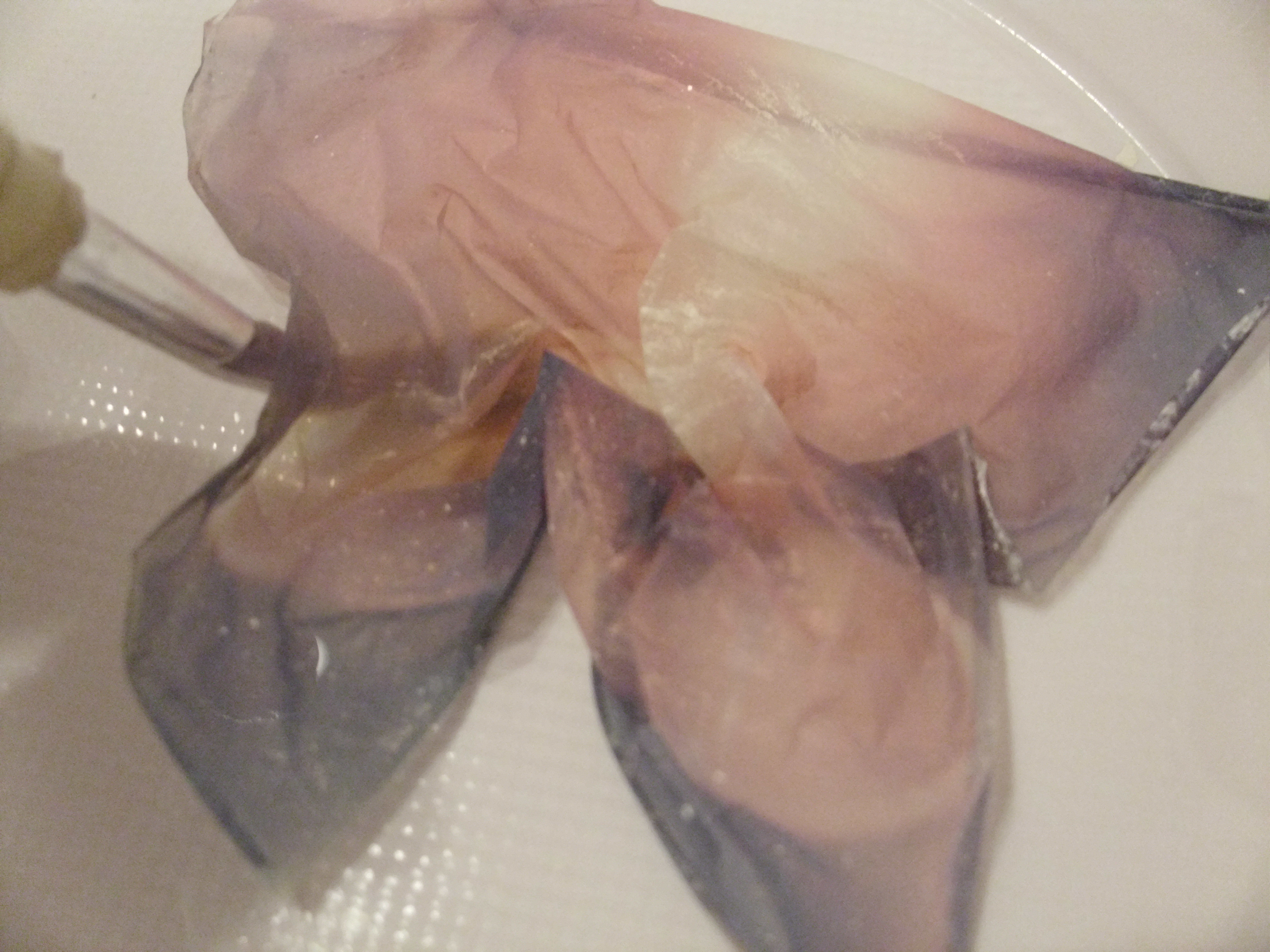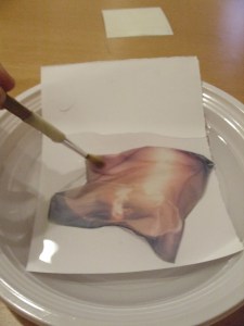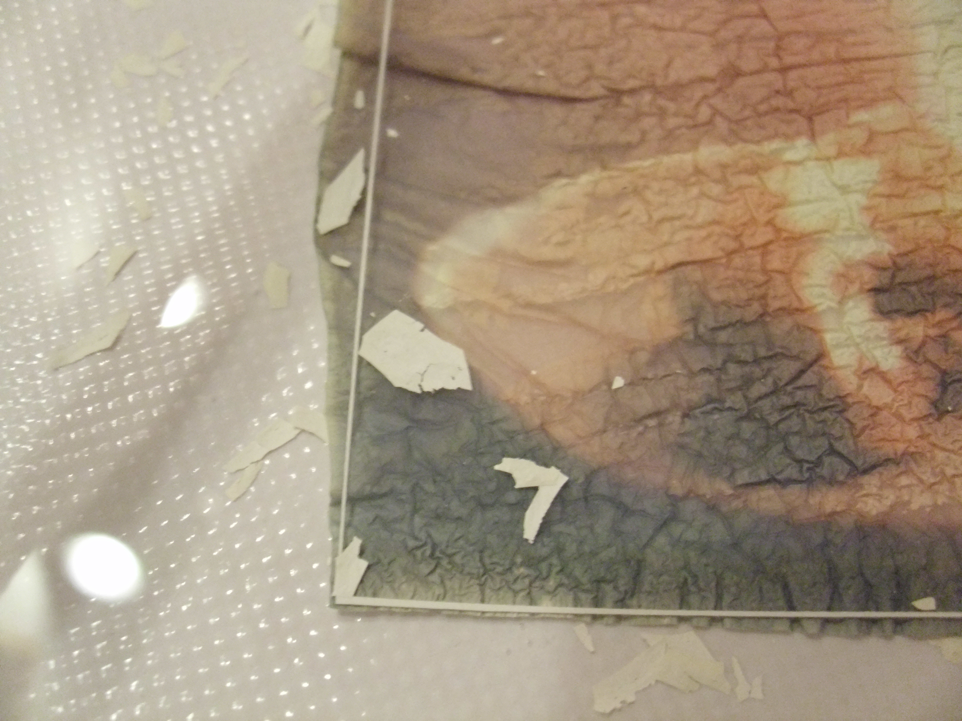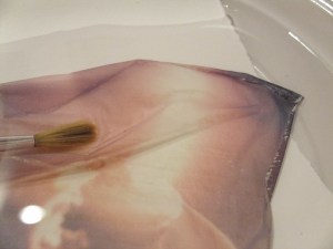 Ci vuole un po’ di pazienza, perché la foto si sposta facilmente con lo scorrere dell’acqua. Per correggerne la posizione, immergiamo nuovamente il foglio dalla parte che ci interessa e modelliamo come più ci piace. Mi raccomando, usate il pennello con la massima delicatezza. Per dare l’effetto increspato, usate il pennello e molta acqua.
