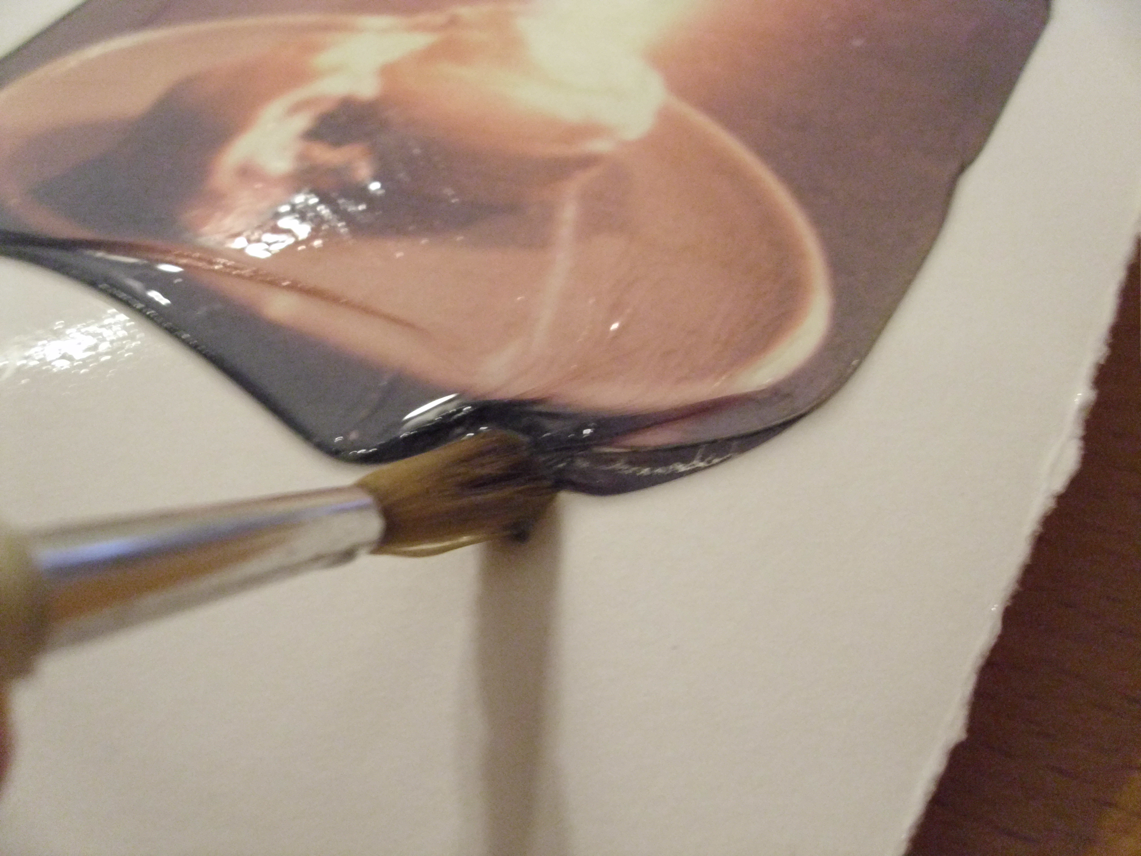 Posizioniamo la foto sul foglio con l’aiuto del nostro pennellino, sempre con un tocco leggerissimo.