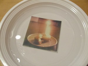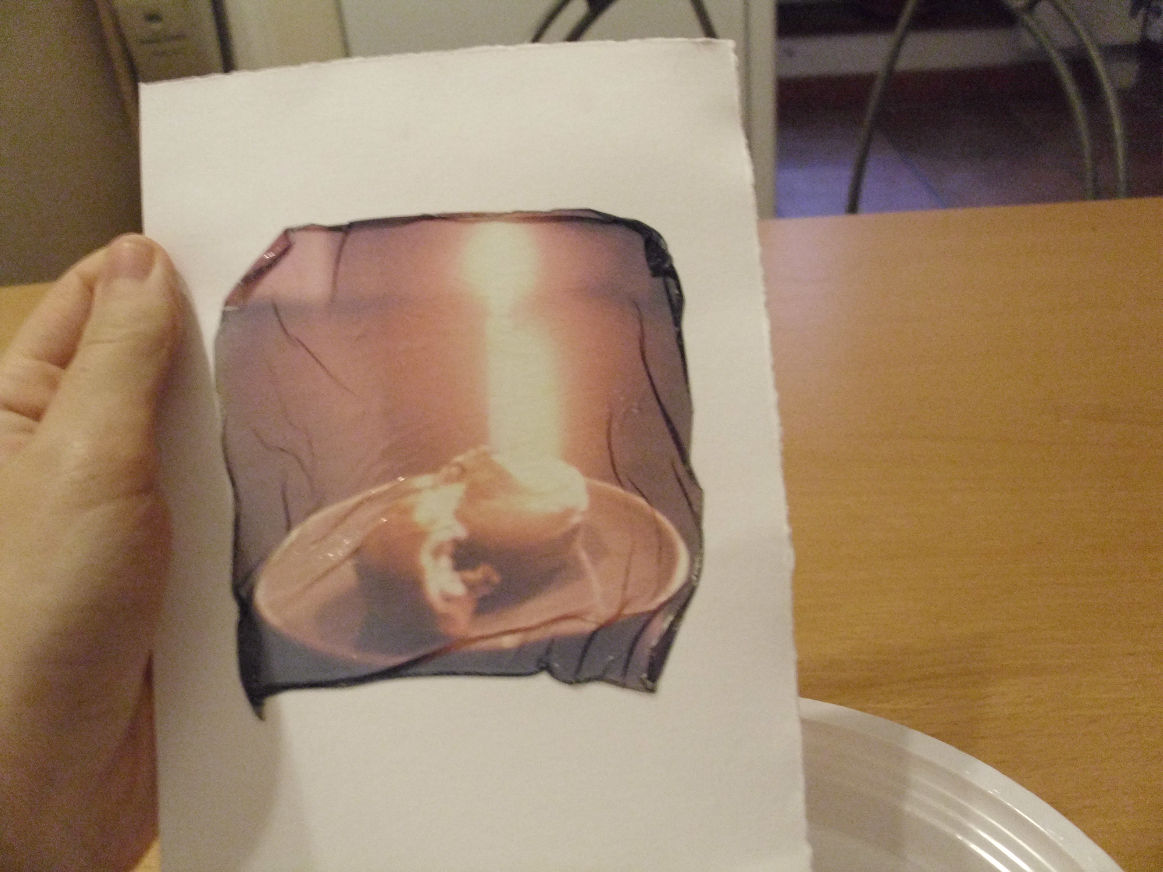 Ora siamo pronti per il trasferimento. Questa è la parte più delicata del processo, per cui fate attenzione. Immergiamo il foglio nella bacinella, cercando di farlo passare sotto la nostra foto che galleggia.