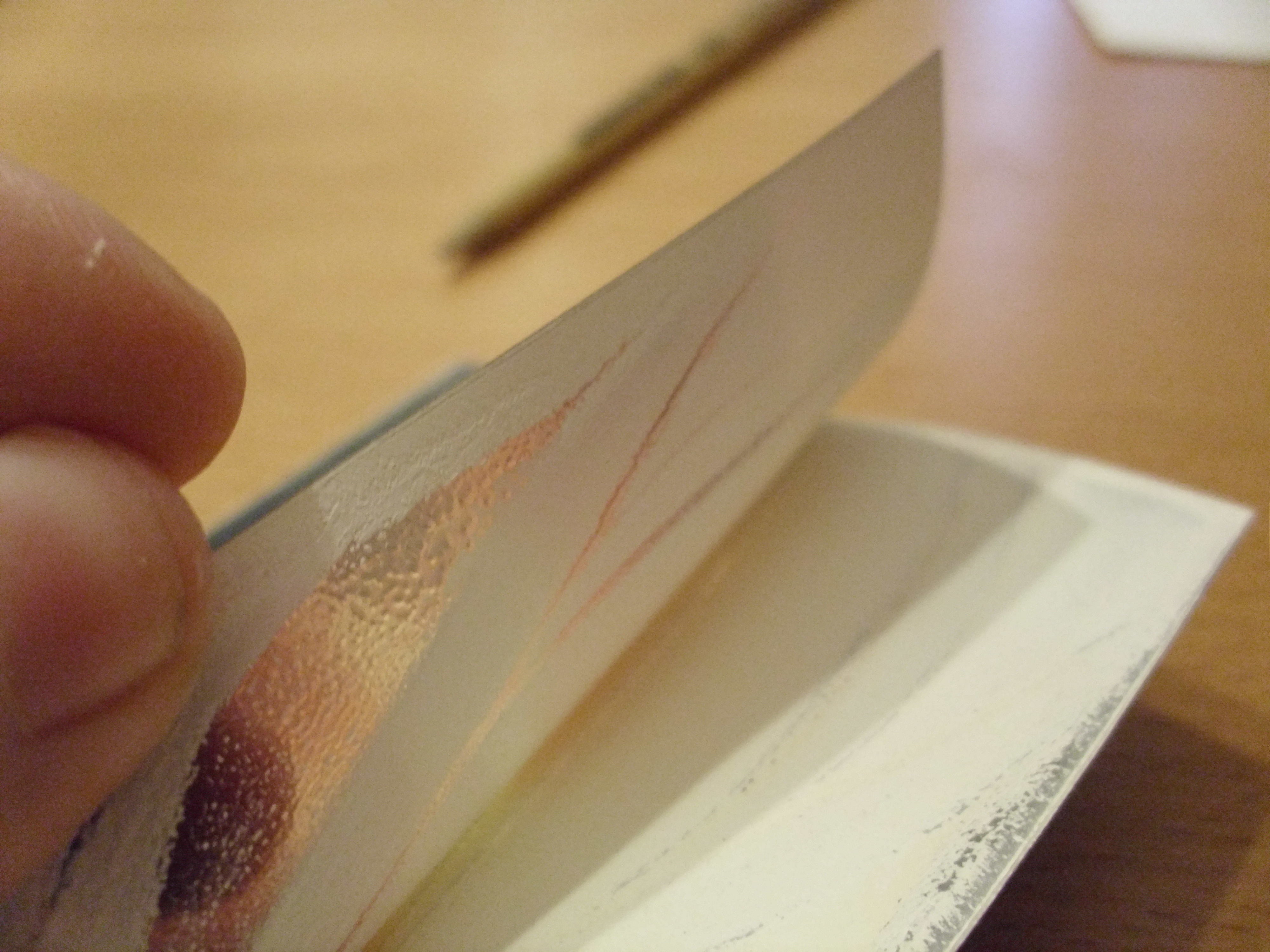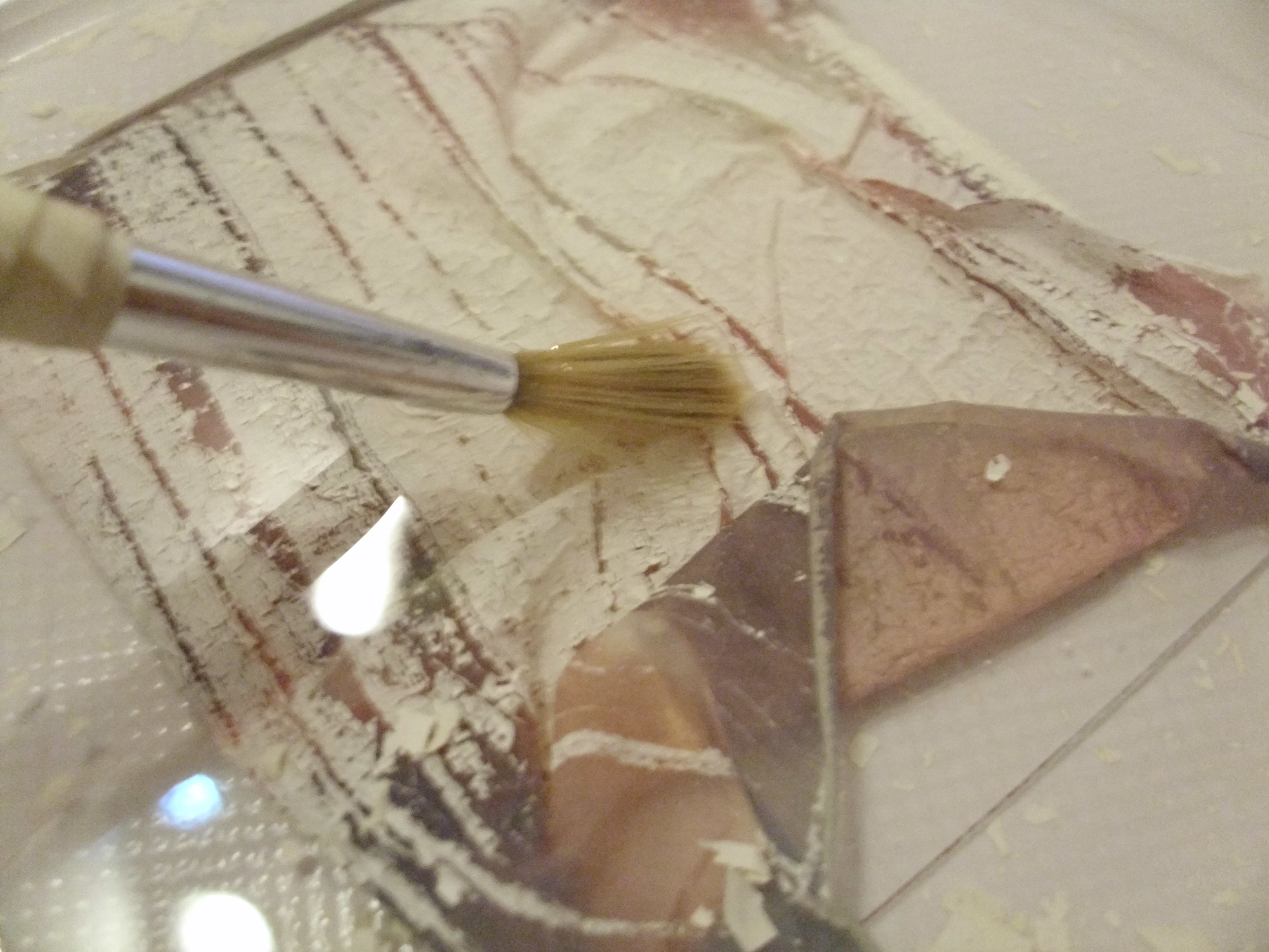 Per eliminare i residui bianchi, possiamo aiutarci con un pennello a setole morbide, di quelli adatti per gli acquerelli. Gentilmente, rigiriamo la foto e cominciamo a togliere via la pastina bianca e a staccare l’emulsione dalla parte trasparente.