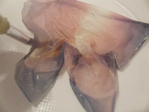 Prima che l’emulsione si sia completamente staccata, afferriamola delicatamente e trasferiamola in una bacinella con acqua a temperatura ambiente, in modo da poter lavorare senza residui.
