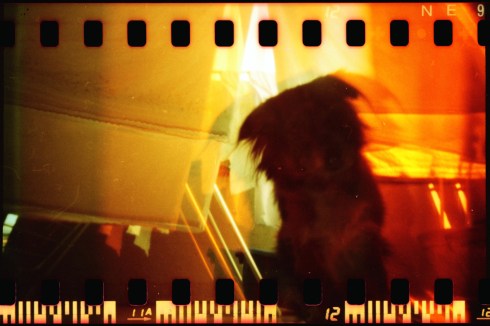 2 pinhole + filtro colorato: è la silhouette della mia cagnetta Nami, che mi guardava incuriosita spostando la testa