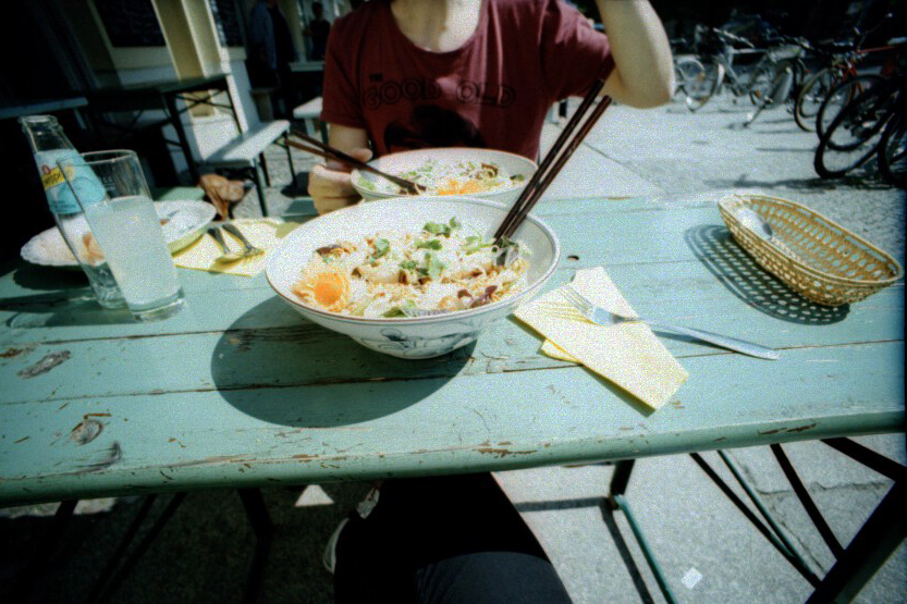 Prendete invece la foto a Rosa Luxemburg Platz, quella del cane che dorme in strada e quella del furgoncino rosa, oppure il piatto vietnamita: dal mirino mi sembrava di aver composto in un’altra maniera, ero molto più vicina di quello che sembra dalla foto! Insomma, un grandangolo così spinto non è sempre prevedibile, credo che bisogna prenderci un po’ la mano.