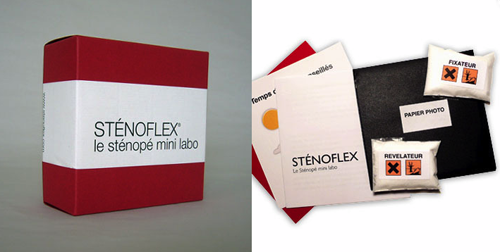 Era molto tempo che la volevo comprare, da quando l’ho vista qualche anno fa, navigando per la rete. La Sténoflex è quella che si chiama una camera obscura, ovvero una scatola con un foro, attraverso il quale entra la luce. A ricevere questa luce, però, non c’è una pellicola, come nelle macchine stenopeiche di cui vi ho parlato nel post precedente, ma un foglio di carta sensibile negativa in cui si imprime l’immagine. Quindi, la cosa meravigliosa è che una volta esposta, la carta va sviluppata proprio come in camera oscura, con la luce rossa, le bacinelle e tutto il resto. Per questo si chiama “mini labo“.