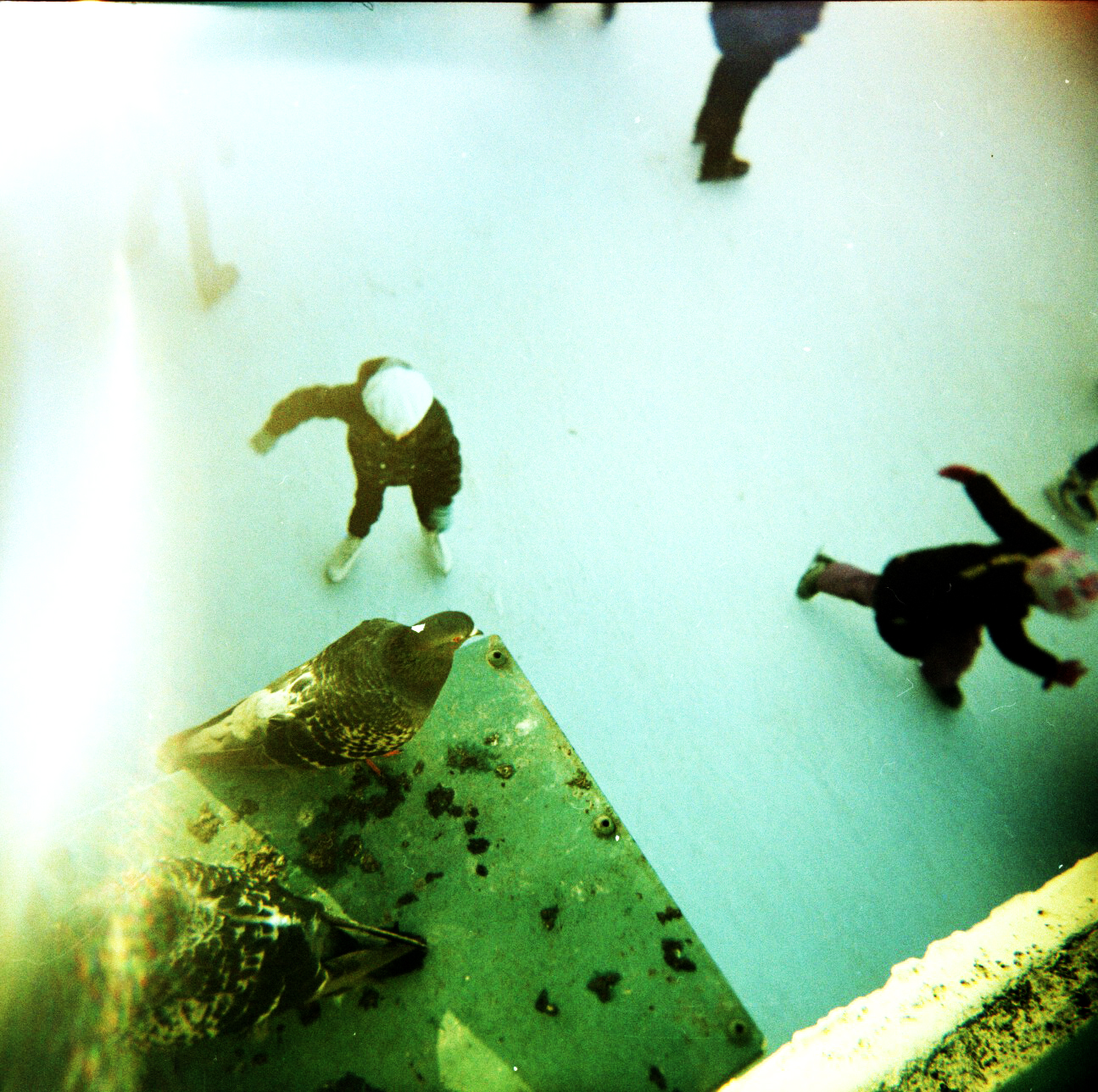 I tuoi post sono una tentazione continua! Anche perchè alcune foto sono visivamente stimolanti, per esempio la prima con quella banda verticale gialla che mi fa pensare ai colori di Rothko, l’inquadratura surrealista dei piccioni con i pattinatori, le gru del porto che si stagliano contro quell’intenso blu ben vignettato dall’Holga. Brava, è sempre difficile fotografare una città senza ricadere nel già visto tante volte ma tu ci riesci sempre!